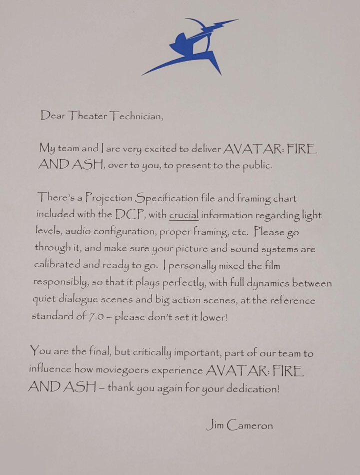 卡梅隆亲自致信影院, 指导如何以最佳效果放映《阿凡达: 火与烬》